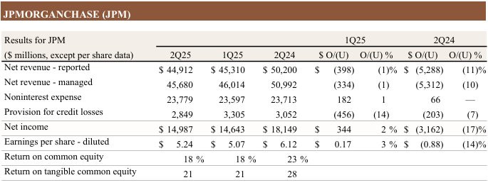 财报显示,摩根大通二季度的整体营收为457亿美元,超出市场预期的440亿美元,但仍低于去年同期的510亿美元。净利润为150亿美元,扣除特殊项目后净利润为142亿美元。净利息收入同比增长2%,达到233亿美元。