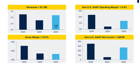 意法半导体最新三季报显示,公司该季度营收为31.87亿美元,同比下降2%,环比增长15.2%;净利润从3.51亿美元下降到2.67亿美元;毛利率为33.2%,同比小幅下降。